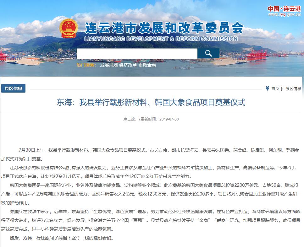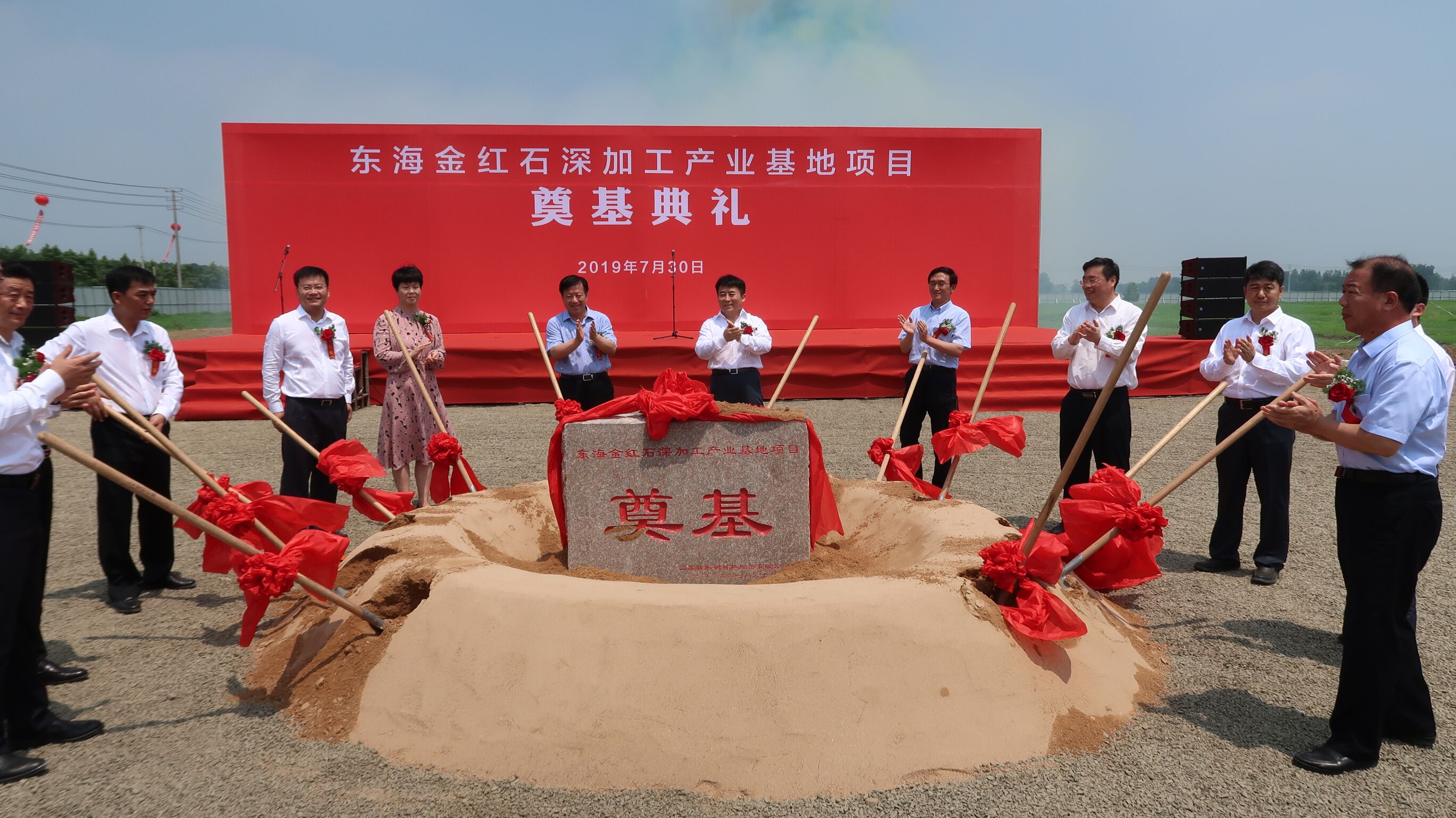 7月30日上午,日照石榴石礦業(yè)東海項(xiàng)目—江蘇載彤新材料金紅石深加工項(xiàng)目在東??h舉行開工奠基儀式,連云港市長方偉,副市長吳海云,東??h領(lǐng)導(dǎo)朱國兵、高美峰、陳啟發(fā)、何東明、郭鵬參加儀式并共同為項(xiàng)目培土奠基。載彤新材料金紅石深加工項(xiàng)目作為縣、市重點(diǎn)推進(jìn)項(xiàng)目受到各方領(lǐng)導(dǎo)和媒體的關(guān)注,連云港市發(fā)展和改革委員會并對奠基儀式進(jìn)行了跟蹤報(bào)道。